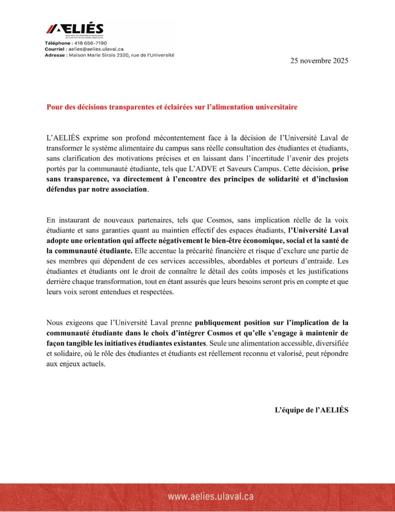 L’AELIÉS exprime son profond mécontentement face à la décision de l’Université Laval de transformer le système alimentaire du campus sans réelle consultation des étudiantes et