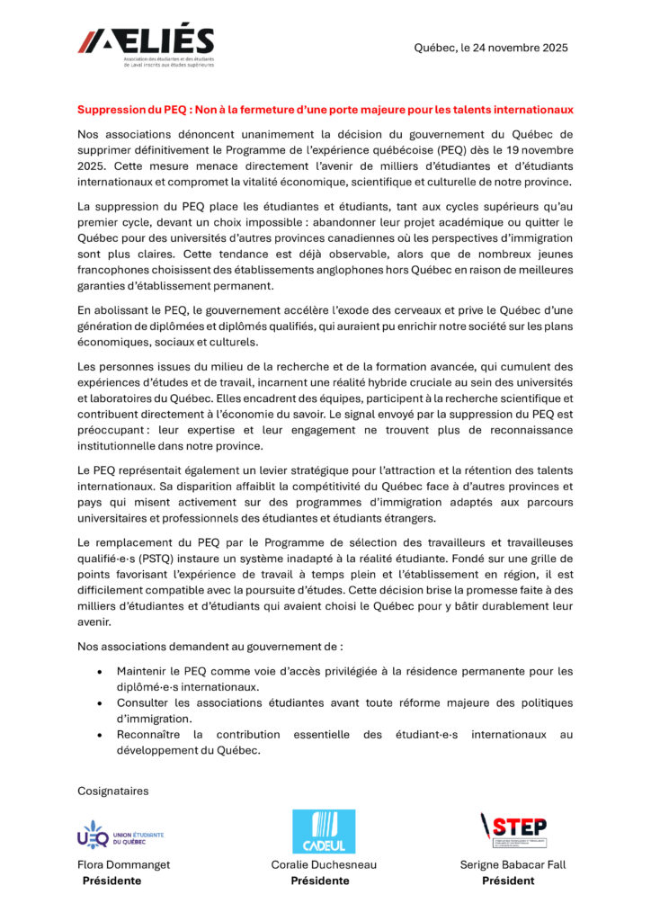 Nos associations dénoncent unanimement la décision du gouvernement du Québec de supprimer définitivement le Programme de l’expérience québécoise (PEQ) dès le 19 novembre 2025. Cette mesure menace directement l’avenir de milliers d’étudiantes et d’étudiants internationaux et compromet la vitalité économique, scientifique et culturelle de notre province.